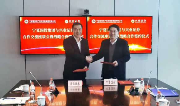 在與興業證券座談會上,張保成總經理介紹了寧夏國投集團的基本情況,同時感謝興業證券長期以來提供的優質專業服務。他表示,作為寧夏回族自治區區屬的國有獨資公司,寧夏國投集團深耕寧夏九個重點發展產業,與興業證券的戰略合作將進一步實現優勢互補,希望雙方在前期良好互動的基礎上,深入推進產業研究、股債融資、項目投資等領域業務合作,構建多元化合作模式。興業證券首席信息官李予濤對張保成總經理一行的來訪表示熱烈歡迎,介紹了興業證券集團近年來的經營發展情況和綜合化金融服務特色。他表示,興業證券作為福建省屬金融機構,擁有全牌照經營優勢,投研能力位居行業前列,大投行服務能力優勢顯著。作為興業證券在寧夏地區的首個戰略合作伙伴,公司將與寧夏國投集團深化雙邊合作,充分發揮自身優勢特長,全方位服務寧夏資本市場發展,不斷為寧夏各類優質企業提供專業化綜合金融服務。會上,張保成總經理與李予濤分別代表雙方簽署戰略合作協議。