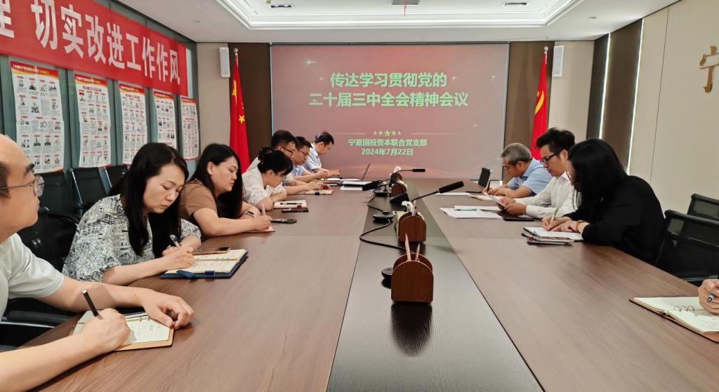 7月22日,寧夏國投資本聯合黨支部召開會議,傳達學習黨的二十屆三中全會精神,抓好全會精神的學習宣傳貫徹工作,推動全面深化改革落實。公司總經理領讀領學《中國共產黨第二十屆中央委員會第三次全體會議公報》,并提出落實意見。黨支部全體黨員及職工群眾參加集體學習。