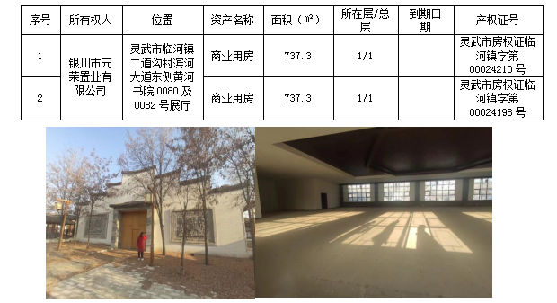 該戶債權抵押物位于靈武市臨河鎮濱河大道東側黃河書院內0080號和0082號展廳,面積共計1474.6平方米。抵押物房屋戶型良好,寬敞明亮,有部分基礎裝修。該地理位置交通便利,距離銀川河東國際機場約3公里。黃河書院集“文化傳播、學習靜修”為一體,環境優美宜人,遠離鬧市喧囂,適合經營飯店、旅游展廳等。