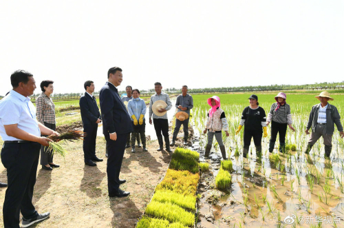 在黃河水滋養下,寧夏平原土地肥沃、物產豐富,素有“塞上江南”之稱。9日下午,習近平來到銀川市賀蘭縣稻漁空間鄉村生態觀光園,聽取寧夏現代農業發展、農業合作社帶動農民增收致富運營模式等情況匯報,觀看寧夏特色農產品展示,了解稻漁種養業融合發展的創新做法。習近平登上觀景塔,俯瞰園區全貌。微風輕拂,秧苗搖曳,一派生機勃勃。他沿著田埂走進稻田,同正在勞作的村民們親切交談。村民們告訴總書記,現在有土地流轉費、勞務費,還有年底分紅,收入提高了,也有保障了。正值放魚時節,習近平舀起魚苗、蟹苗,放進田邊水渠。習近平強調,發展現代特色農業和文化旅游業,必須貫徹以人民為中心的發展思想,突出農民主體地位,把保障農民利益放在第一位。要探索建立更加有效、更加長效的利益聯結機制,確保鄉親們持續獲益。要注意解決好稻水矛盾,采用節水技術,積極發展節水型、高附加值的種養業,保護好黃河水資源。目前,疫情防控形勢穩步向好,要繼續抓好常態化疫情防控,加快恢復社會生產生活正常秩序。