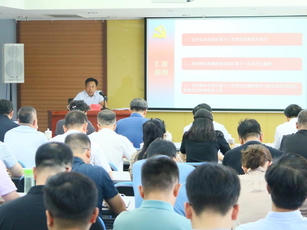 深學細讀,研討促學,迅速深化對黨代會精神的認識和理解。讀書班期間,先后認認真真、原原本本學習了第十三次黨代會報告全文、自治區黨委梁言順書記在黨代會閉幕式上的講話、在自治區黨委十三屆一次全會上的講話,以及自治區黨委新聞發布會關于黨代會工作報告的解讀,做到系統學習、深刻領會。召開黨委理論學習中心組擴大會議,全體領導班子成員、各部室負責人及子企業黨組織書記結合工作崗位、聯系工作實際,逐一進行交流研討,集思廣益,在交流研討中不斷汲取智慧和力量。各基層黨支部召開黨員大會、“主題黨日”,全體黨員談感受、談想法、談打算,紛紛表達了將學習成果轉化為奮發前進動力的決心,形成了深化學習黨代會精神的濃厚氛圍。