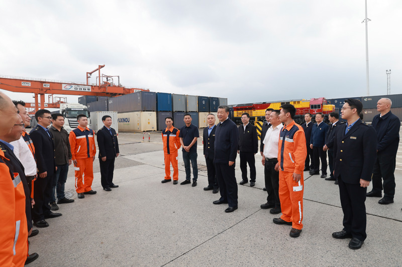 4月22日至24日,中共中央總書記、國家主席、中央軍委主席習近平在重慶考察。這是22日下午,習近平在重慶國際物流樞紐園區重慶鐵路集裝箱中心站,同貨車司機、列車司機、裝卸工人、場站管理人員等親切交流。新華社記者 岳月偉 攝