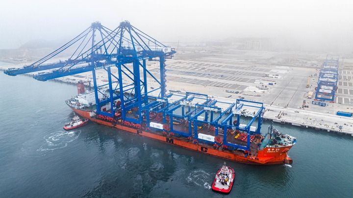 ??2024年6月27日,岸邊集裝箱起重機和軌道吊運抵秘魯錢凱港。新華社發(上海振華重工供圖)