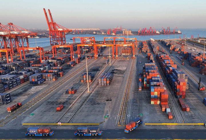 ??2024年11月5日拍攝的唐山港京唐港區集裝箱碼頭堆場(無人機照片)。新華社記者 楊世堯 攝