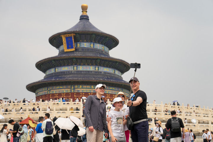 ??2024年7月9日,來自瑞士的游客在北京天壇公園祈年殿前合影。新華社記者 鞠煥宗 攝