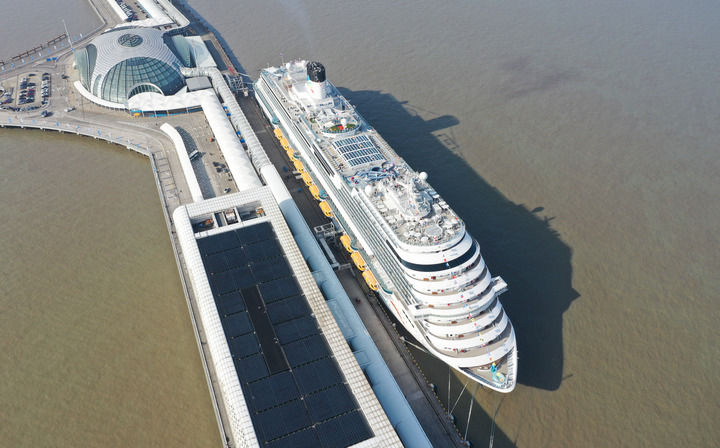 ??2024年1月1日,“愛達·魔都號”停靠在上海吳淞口國際郵輪港(無人機照片)。新華社記者 丁汀 攝