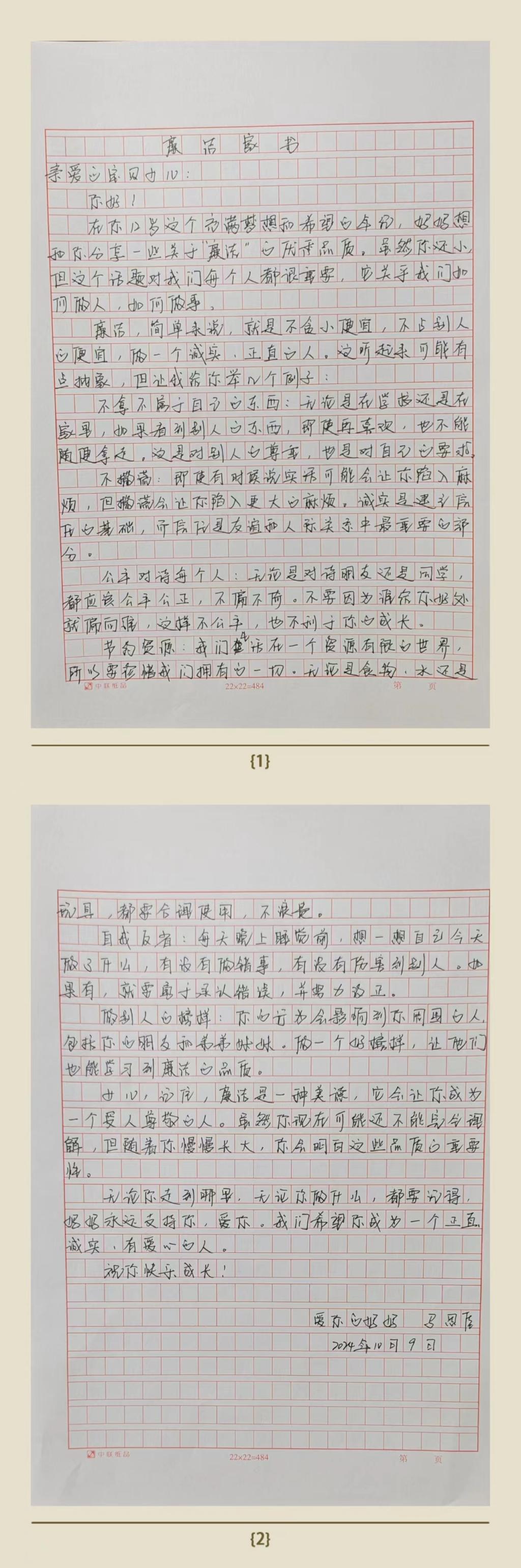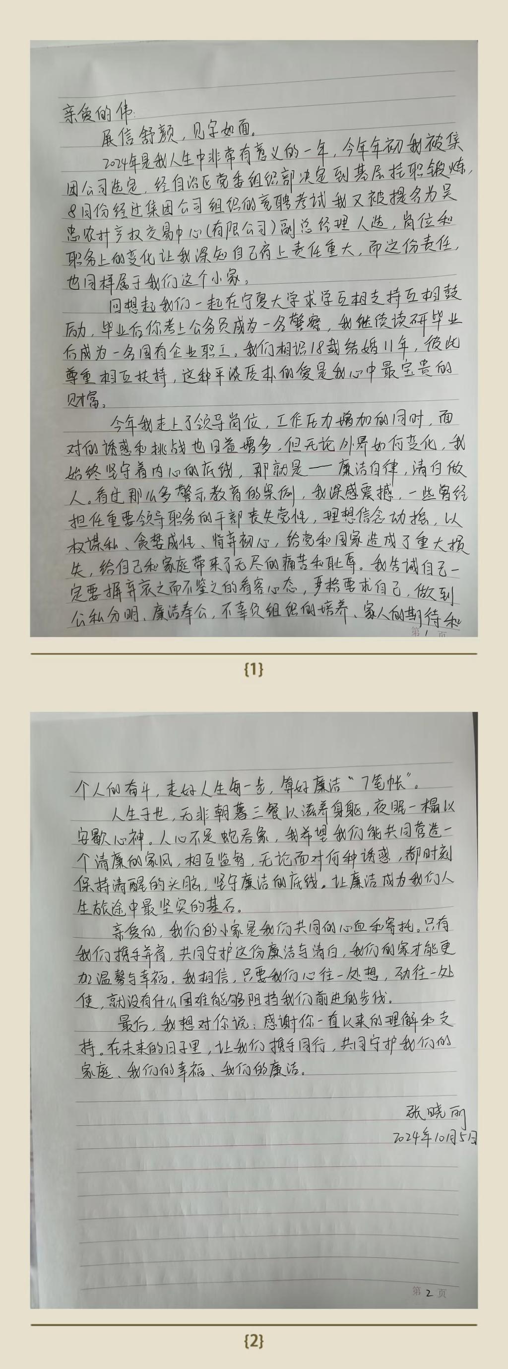 近日,寧夏國投集團紀委開展“清風寄語·家風話廉”廉潔家書征集評選活動,集團本部和子企業干部職工及家屬積極踴躍參與,紛紛執筆書寫廉潔家書,表達對親人的關愛,對清廉的堅守和對生活的感悟。此次活動共征集到廉潔家書32封,其中有父母的諄諄教誨,盼子女清廉自律、平安還家,例如“做人做事講誠信、有擔當、有原則、有底線,同時還要廉潔自律。這也是我們家的家風體現,要把我們家的這種精神一直傳承下去”;也有夫妻間的相互共勉,愿攜手并進,廉潔齊家,例如“回想起我們一起在大學求學互相支持、互相鼓勵,相識十八載,彼此尊重、相互扶持,這種平淡質樸的愛是我心中最寶貴的財富。人生于世,朝暮三餐以滋養身軀,夜眠一榻以安歇心神,希望我們能共同營造一個清廉的家風,相互監督,無論面對何種誘惑,都時刻保持清醒的頭腦,堅守廉潔的底線”;還有孩子的童言稚語,希望父母以身作則,廉潔傳家,例如“廉潔,就是不貪小便宜,不占別人的便宜,做一個誠實、正直的人,不拿不屬于自己的東西、不撒謊、節約資源、做別人的榜樣”;更有致自己的警句諍言,立志潔身自好,廉潔顧家,例如“面對金錢的誘惑,要始終保持正直和誠實,守住內心的底線”。一段段文字寄托了家人的殷切期望,展現了新時代寧夏國投干部職工的良好文明風尚。